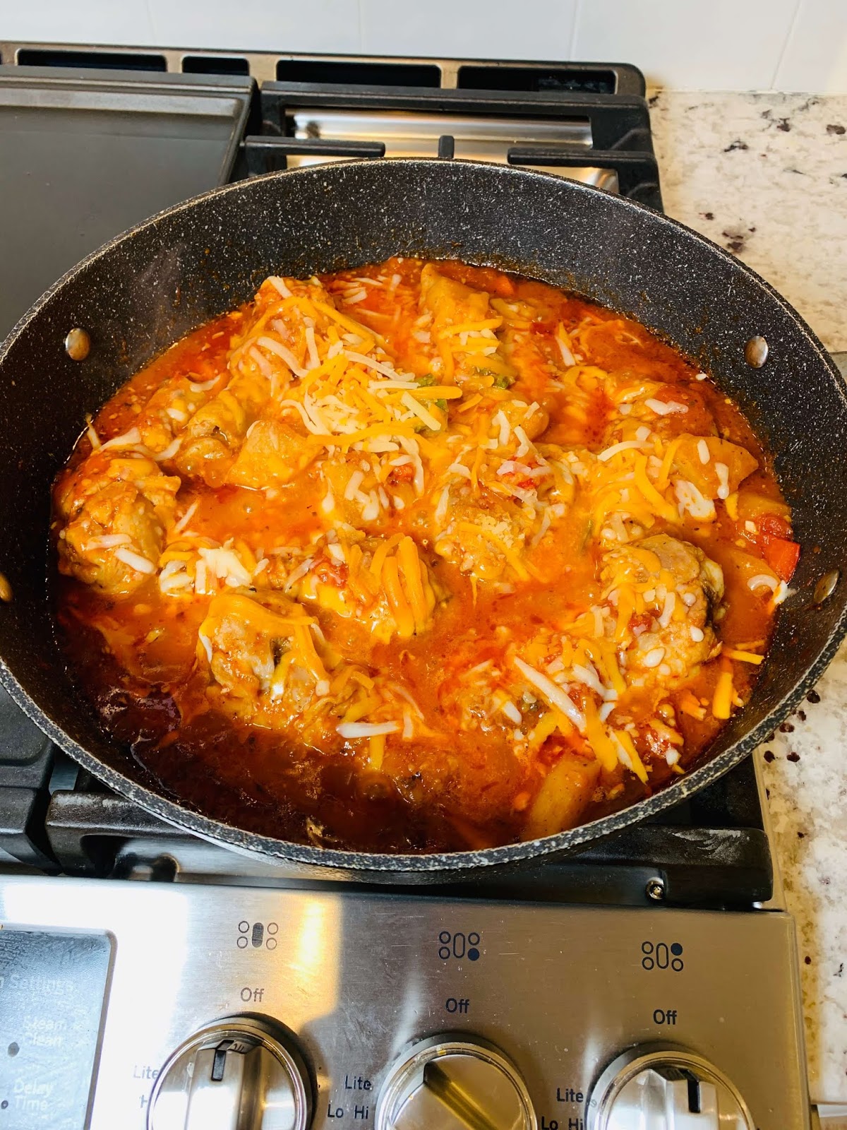This Cheesy Chicken Afritada is a colorful, comforting Filipino dish made with tender chicken simmered in tomato sauce, fresh vegetables, and a generous topping of melted Cheddar and Mozzarella cheese. It’s a family‑favorite recipe that brings warmth, flavor, and nostalgia to the table.