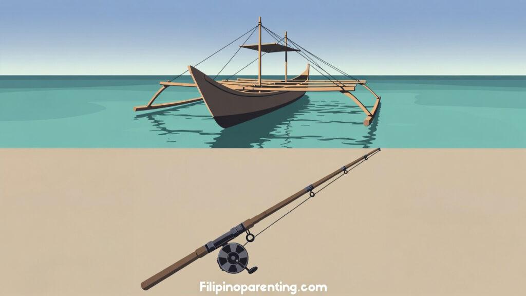 Fishing in Tagalog: An illustration of a traditional Filipino bangka boat and a fishing rod to help learners master fishing phrases.